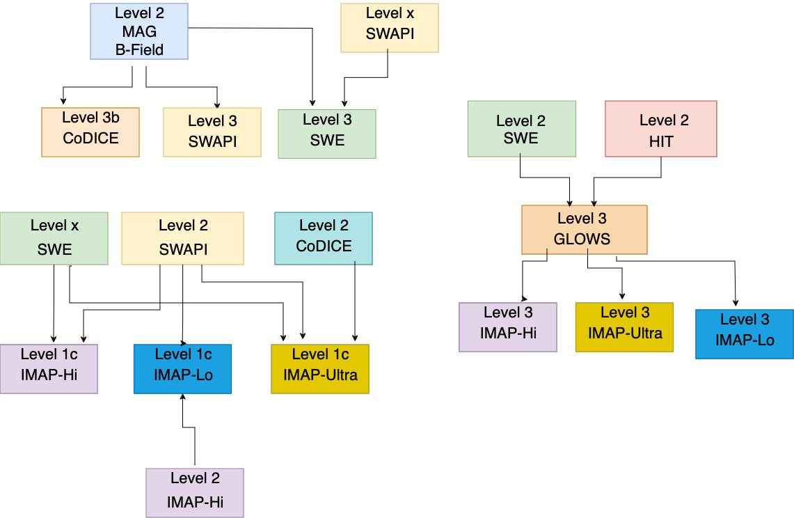 For IMAP, a key goal of the overall science is to cross-calibrate different instruments. This means that all the instrument processing is intermingled, with some high levels of one instrument going into the low levels of another instrument. Due to this requirement, we aren’t able to process all level 1 data files, then all level 2 data files, then all level 3 data files, but instead need to be more flexible with our processing design.
