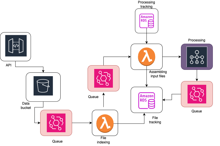 This is a (simplified) diagram of our processing pipeline which highlights where we use queues (in red.) Queues connect different pieces of architecture together and are a critical part of the overall design.